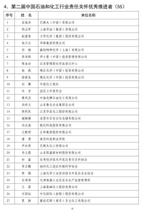 为了继续鼓励全国石油和化工行业各类组织和个人更好地组织、践行责任关怀,强化管理体系建设,推进全行业安全、环保和职业健康工作,中国石油和化学工业联合会责任关怀工作委员会(CPCIF RCC)与国际化工协会联合会责任关怀领导小组(ICCA RCLG)组织开展了第二届全国石油和化工行业开展责任关怀先进单位和先进个人评选动,经组织推荐,专家综合评审, ICCA RCLG 与 CPCIF RCC 联合审定,决定授予南京江北新区新材料科技园等 9 个单位责任关怀最佳组织单位;授予中海壳牌石油化工有限公司等 41 个企业责任关怀最佳实践单位;授予南京江北新区新材料科技园管委会主任卞钟武等 19 位同志责任关怀卓越领导者;授予巴斯夫(中国)有限公司岳海兵等 55 位同责任关怀优秀推进者。